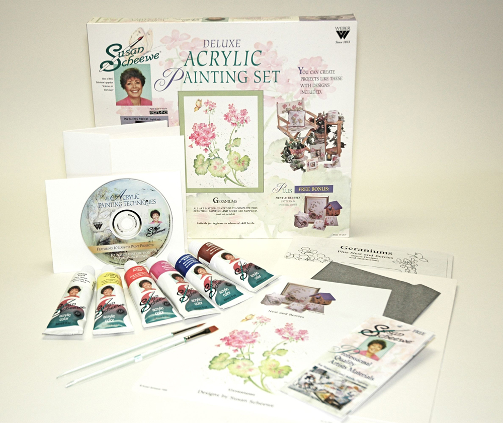 Artists of all skill levels can create countless projects using the designs and art materials included in this Deluxe Painting Set. Susan’s video introduces acrylics, techniques and tips along with numerous painting suggestions. This home workshop set includes all of the following Susan Scheewe art materials:6, 37ml tubes of richly pigmented, nontoxic acrylic colors, 2 artists brushes, 2 sheets of 9″x12″ 185 lb artists paper, 2 each greeting cards and envelopes, wax free transfer paper, comprehensive patterns and painting instructions for two designs plus many suggestions for other painting projects, 1/2 hour Getting Started video and a reusable storage tray and box. Made in the USA.